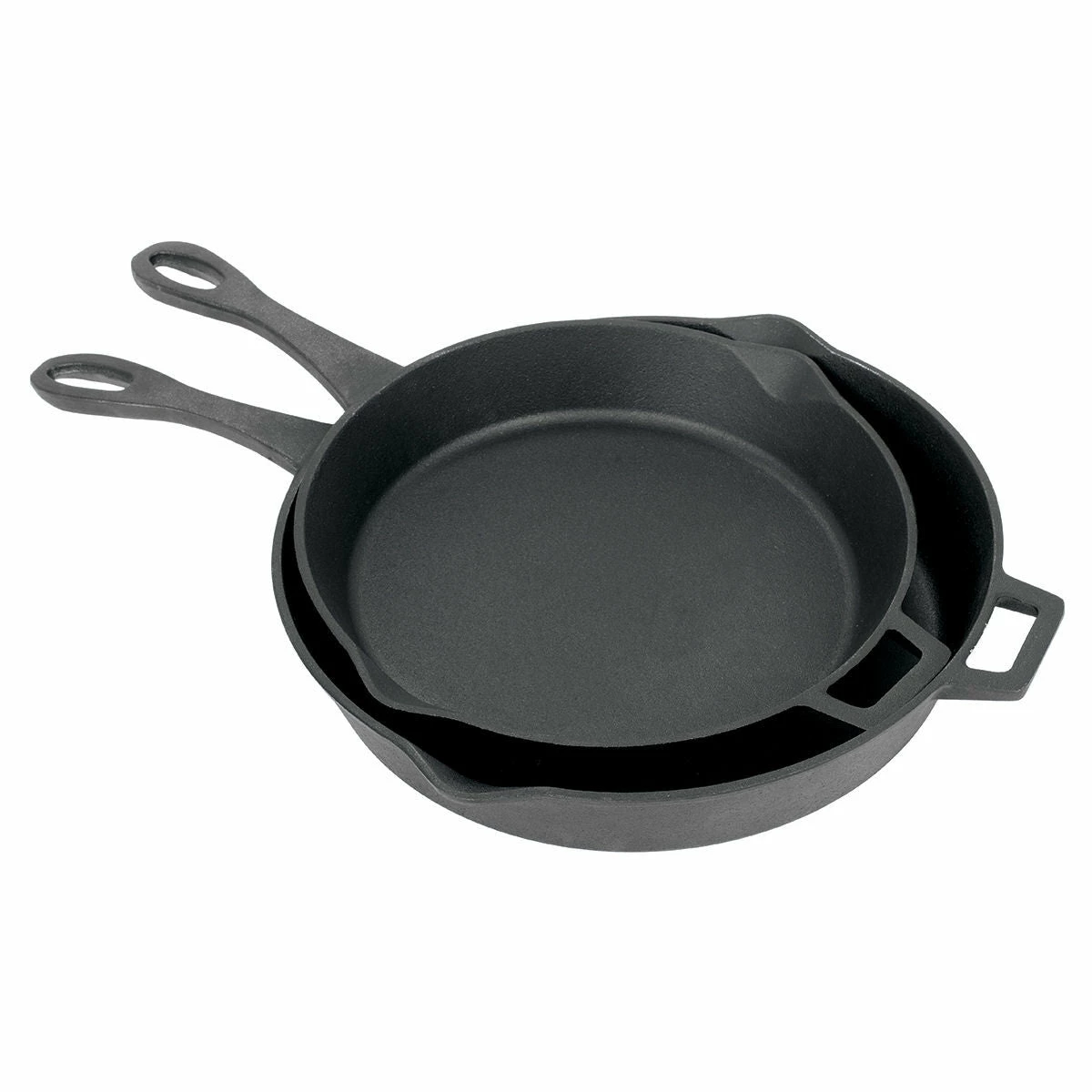 Bayou Classic 2 Piece Cast Iron Skillet SetĀ sizes: Ā 12″ & 14″. TheĀ Bayou Classic 2 Piece Cast Iron Skillet SetĀ is a little more versatile in their use. Ā These are not the skillets you would want if you are looking to cook a few eggs. Ā These are more for bigger foods. Ā These cast iron skillets do include eyes in the handle for hanging.