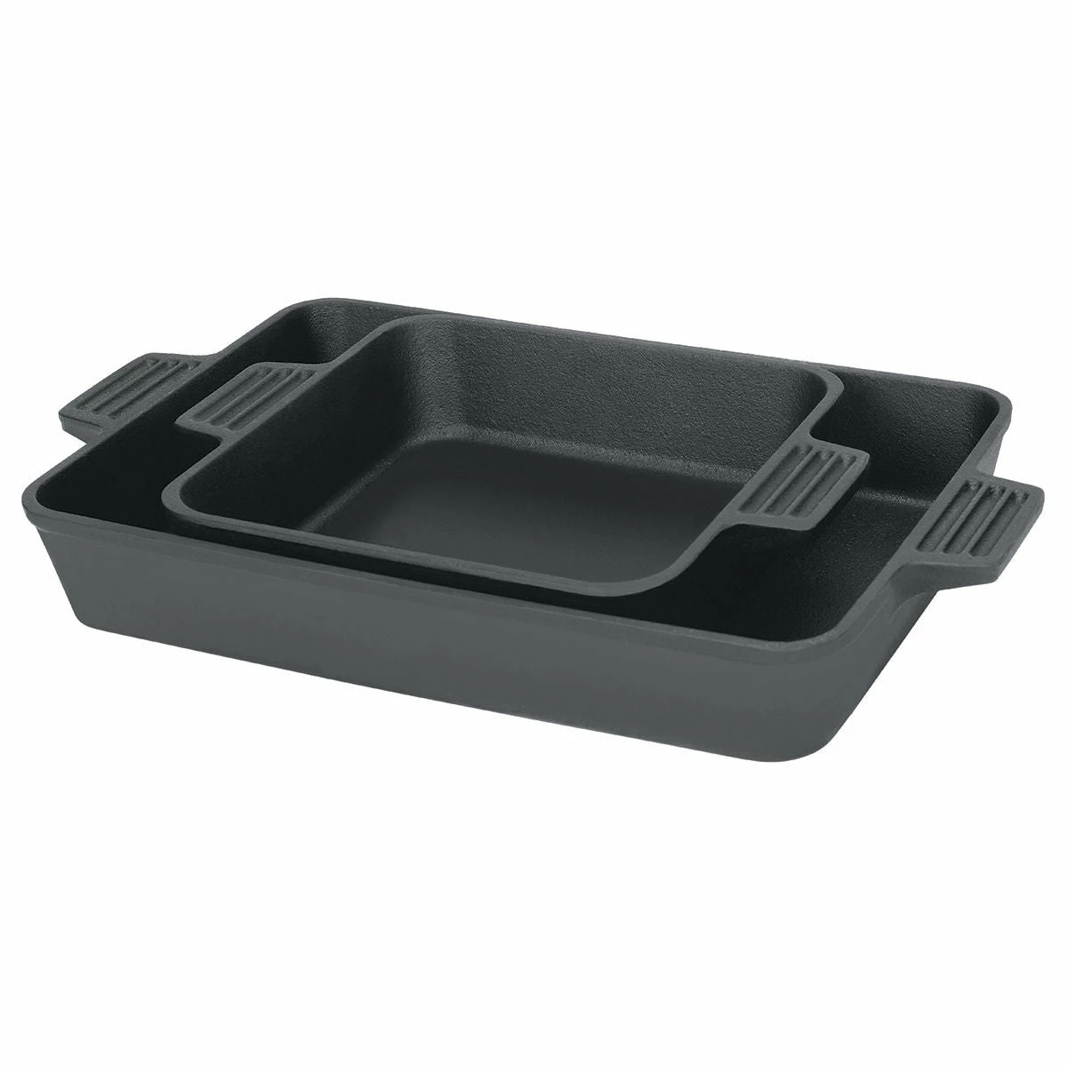 The Bayou Classic Cast Iron Baking Pan Set includes two cast iron bake pans – 8 x 8 & 13 x 9. The sizes are what is used most in an everyday kitchen. Both cast iron baking pans have handles. You can nest them together for easy storage.
