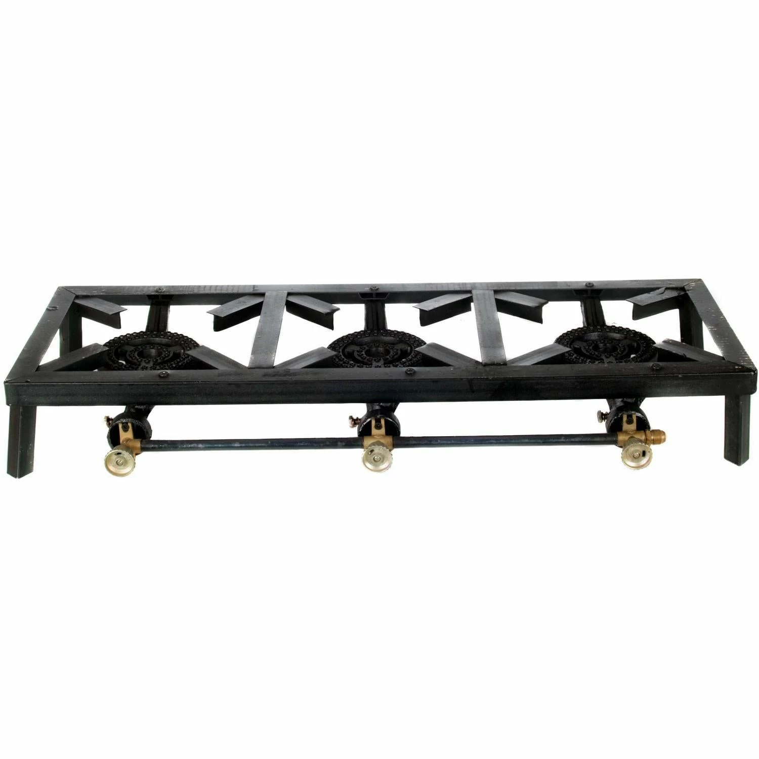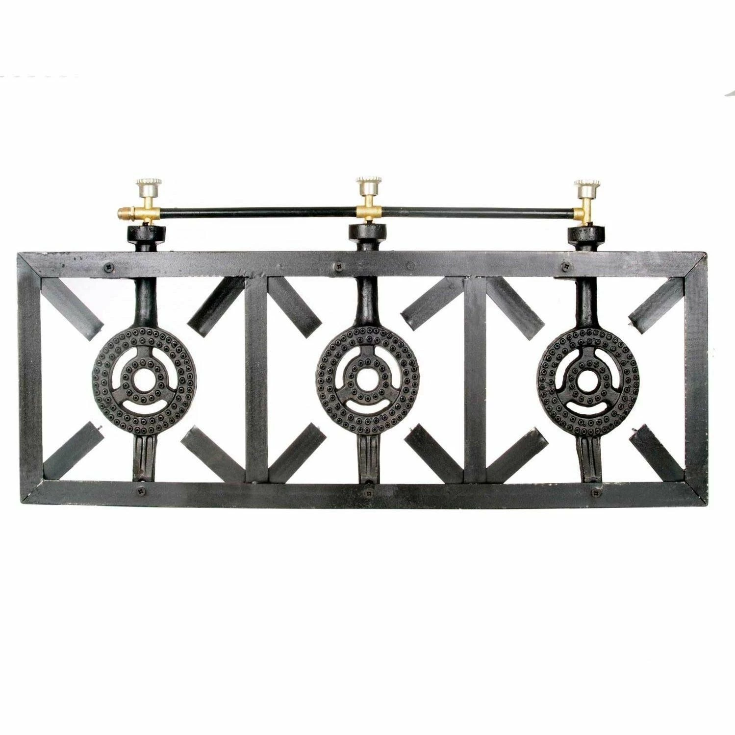 This Cajun Classic triple unit burner has a 20,000 BTU rating and is appropriate for stove top style cooking. Dimensions (in inches): 12 D x 33 W x 6 H. Gas burner: 4. 5 inches in diameter. Designed for use with propane fuel only – Hose and regulator are not included. Assembly required.