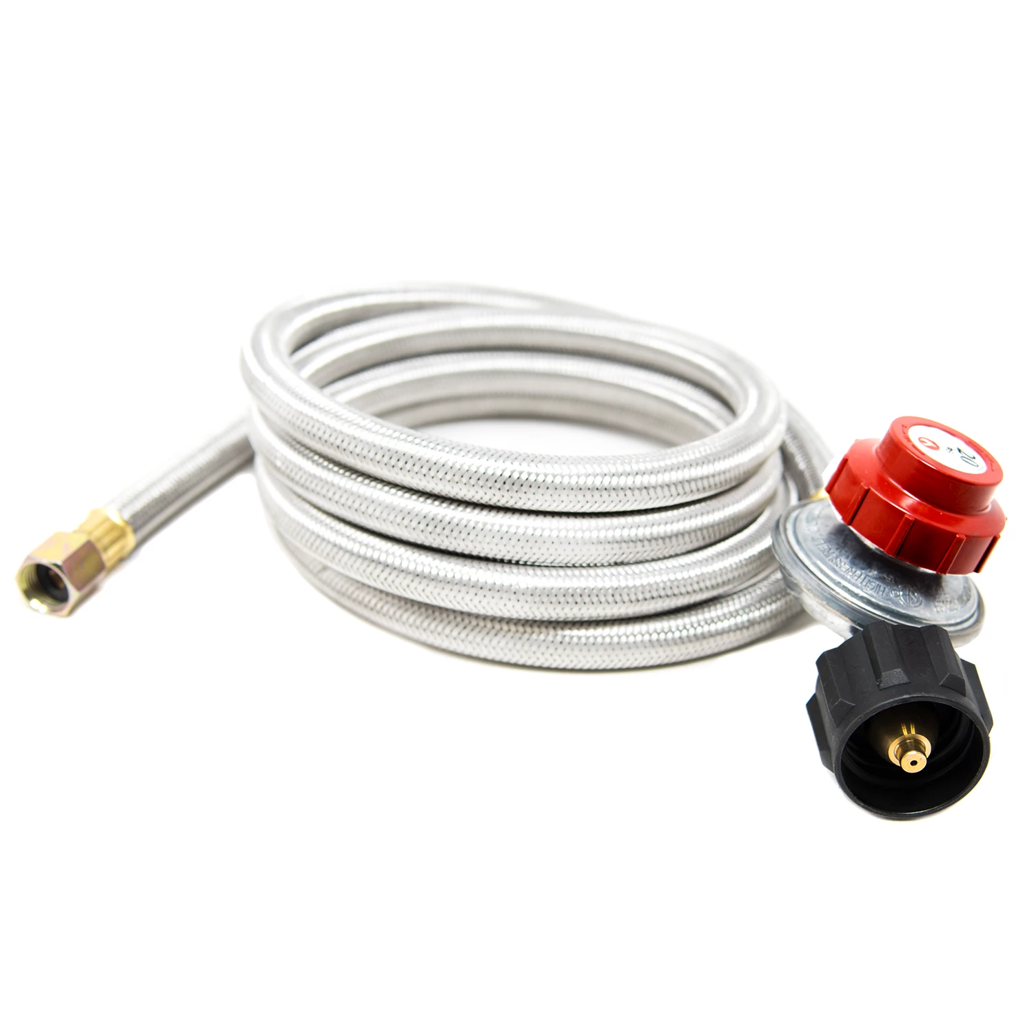 The 8 Foot High Pressure Propane Regulator Kit includes a 0-20 PSI propane regulator and 8 foot stainless steel propane hose. The 8 Foot High Pressure Propane Regulator Kit is designed to be a safe, reliable equipment used with high pressure outdoor burners. With this simple propane regulator, you’ll be able to use your camp stove or propane burner while having the comfort of knowing that safety is the least of your worries. All that you need to do is attach one end to a propane tank and the other to an outdoor burner—then you’re good to go!