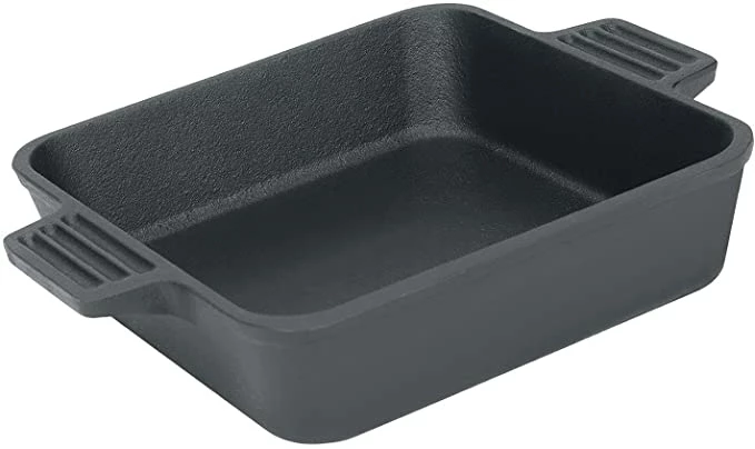 The Bayou Classic Cast Iron Baking Pan Set includes two cast iron bake pans – 8 x 8, The size are what is used most in an everyday kitchen. Cast iron baking pans have handles. Perfect for cornbread, biscuits and casseroles!
