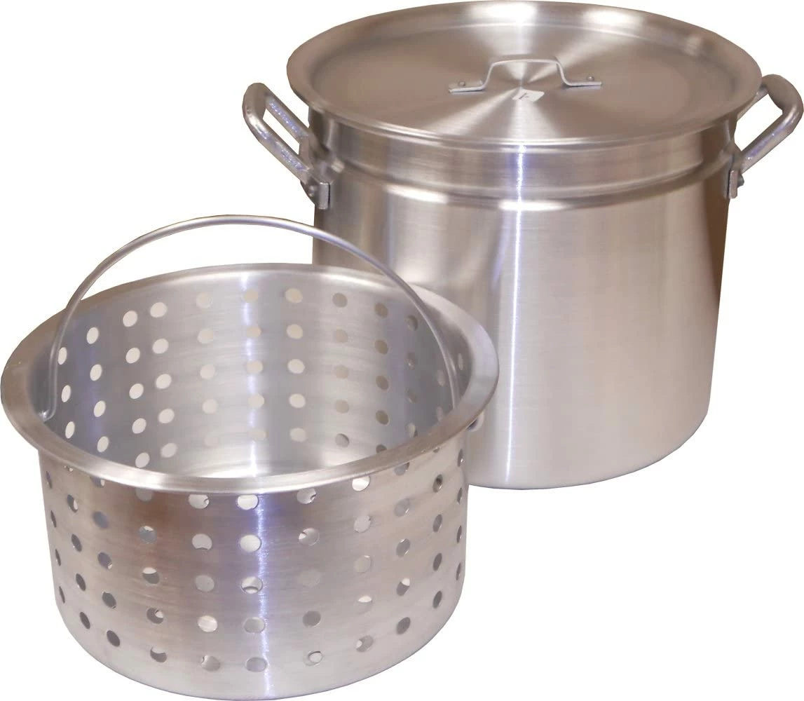 The 100 quart Food Steamer Pot is a large 100 qt aluminum stock pot with a lip close to the top of the stock pot that holds the stock pot steamer basket. The basket hangs a few inches of the bottom of the pot allowing you to steam seafood or veggies.