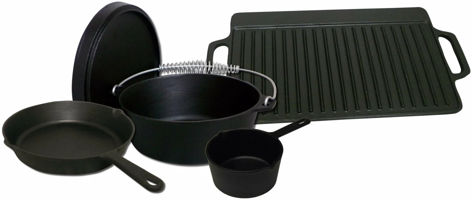 Great Dutch Oven for frying fish or chicken. Dutch Oven and Lid combo are also, good for stewing chili, stews, soups, etc. Cook bacon and eggs, sear steaks or blackened fish filets with the double sided cast iron griddle. Use the Sauce Pot to top off any meal with either BBQ sauce or Gravy to add the perfect finishing touch! Cast iron construction allows for even heat distribution, eliminating cold spots. Pre-seasoned and ready to cook!