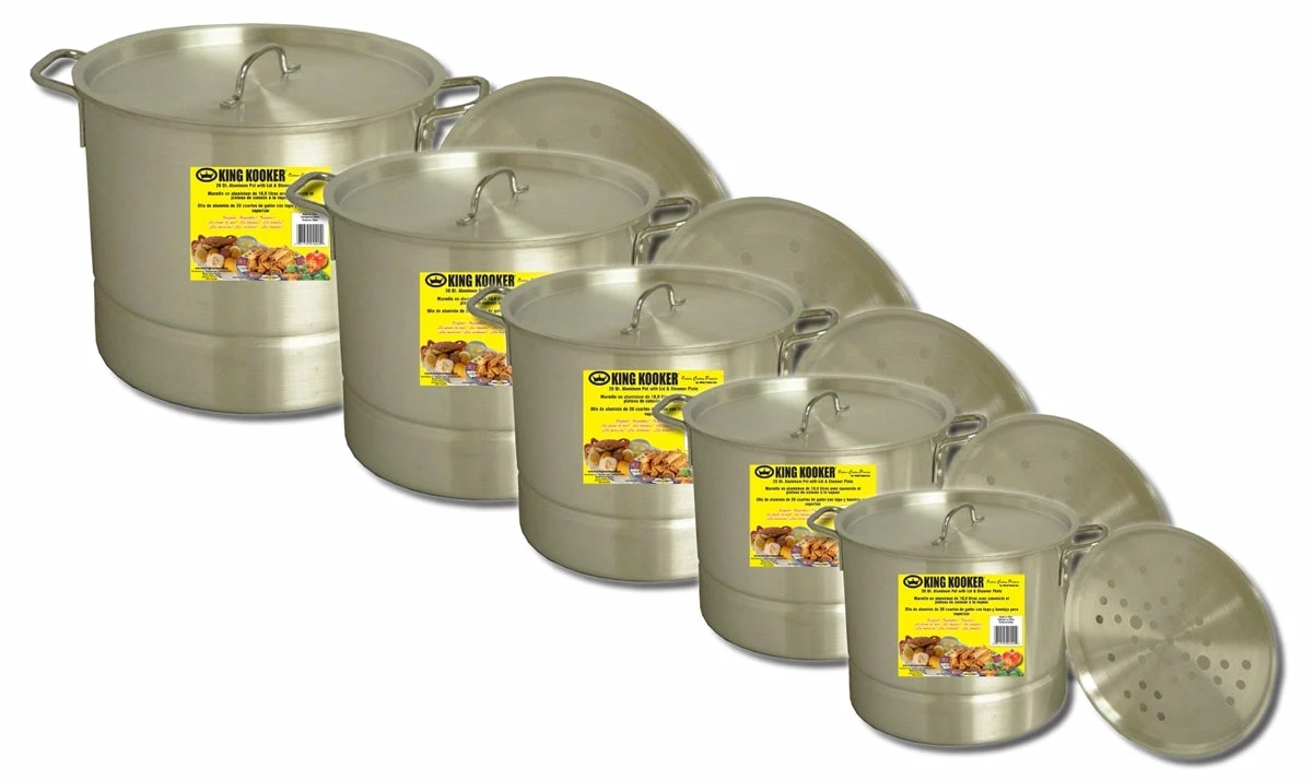 Aluminum Professional Stock Pot Set includes five large stock pots with lids and steamer plates. The steamer plates make the Aluminum Professional Stock Pot Set steamer pots. This Aluminum Professional Stock Pot Set is made of thick polished aluminum construction for fast even heating, easy cleaning and low maintenance. The Aluminum Professional Stock Pot Set includes 20, 24, 32, 40 and 52 quart aluminum stock pots with lids.