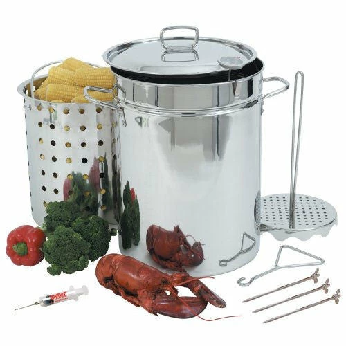 The Bayou Classic Stainless Steel Turkey Fryer Pot is a 32 quart stainless steel turkey fryer pot. It’s the perfect size to fry a perfect turkey or boil the perfect pot of crawfish. This stainless steel turkey fryer pot is our best selling pot out of all of our turkey fryer pots. The Bayou Classic Stainless Steel Turkey Fryer Pot includes all stainless steel turkey fryer accessories. These stainless steel turkey fryer accessories are dishwasher safe. The stainless steel used to make this pot is 18/8 gauge stainless steel, which is commercial grade. Unlike the competitors pots you find in the “Mart” stores, you kick this one . . . you hurt your foot and not the pot. The Bayou Classic Stainless Steel Turkey Fryer Pot includes the stainless steel turkey fryer pot, stainless steel turkey fryer basket, vented lid, stainless steel perforated poultry rack and grab hook, stainless steel turkey fryer thermometer, trail seasoning injector (not stainless steel) and 3 piece chicken skewer set. The Bayou Classic Stainless Steel Turkey Fryer Pot is the premium choice for those who demand the highest quality products for their outdoor cooking needs. The Bayou Classic Stainless Steel Turkey Fryer Pot measures 12 inches x 17 1/2.